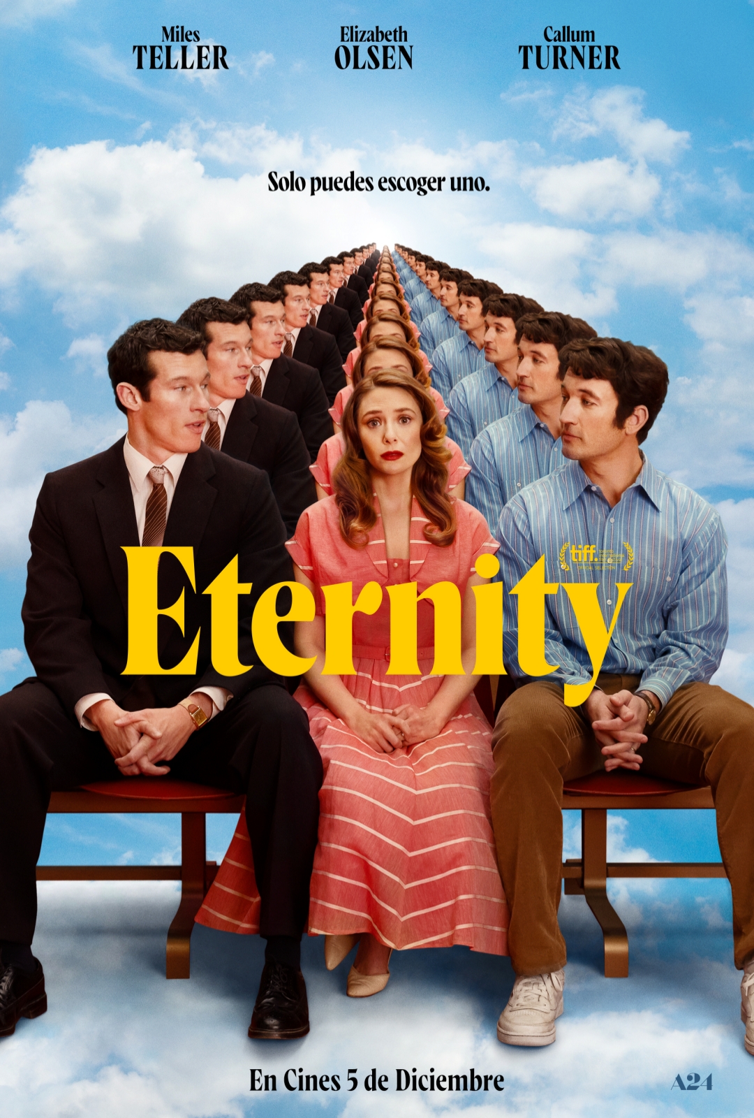 A24 estrenará en cines en España, 'ETERNITY', una comedia romántica de ciencia ficción protagonizada por Miles Teller ('Whiplash', 'Top Gun'), Elisabeth Olsen ('Bruja Escarlata y visión') y Callum Turner (Animales fantásticos), y dirigida por David Freyne y coescrita por Freyne junto a Pat Cunnane. Completan el reparto John Early, Olga Merediz y Da'Vine Joy Randolph.