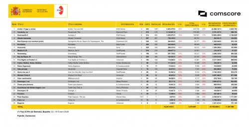 # Semana: (02-04 de Enero) - El fin de semana del 2 al 4 de Enero de 2026 las veinticinco películas más taquilleras recaudaron 10.247.410 euros gracias a 1,275.640 espectadores.