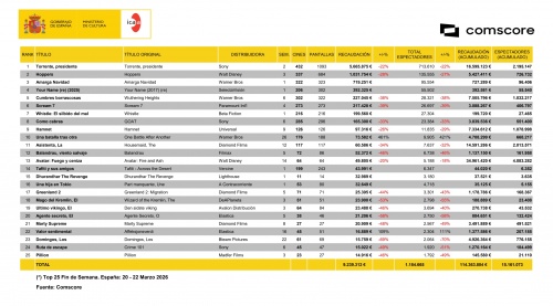 #12ª Semana: (20-22 de Marzo) - El fin de semana del 20 al 22 de Marzo de 2026 las veinticinco películas más taquilleras recaudaron 9.239.312 euros gracias a 1.184.665 espectadores.