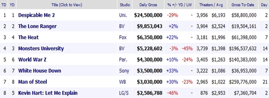 Nuevamente con Steve Carell poniendo su voz al supervillano apodado Gru, la secuela de 'Mi villano favorito' abrió en la madrugada del martes al miércoles convirtiéndose en la mejor apertura para Universal en un miércoles, así como el octavo mejor estreno de la historia en ese mismo día (tercero si hablamos de una cinta de animación). A nivel internacional, la película ha recaudado más de 65 millones de dólares por lo que ya supera los 100 millones en todo el mundo apenas unas horas después de su apertura. Este fin de semana llega a 38 mercados importantes, por lo que podría alcanzar unas cifras excelentes.