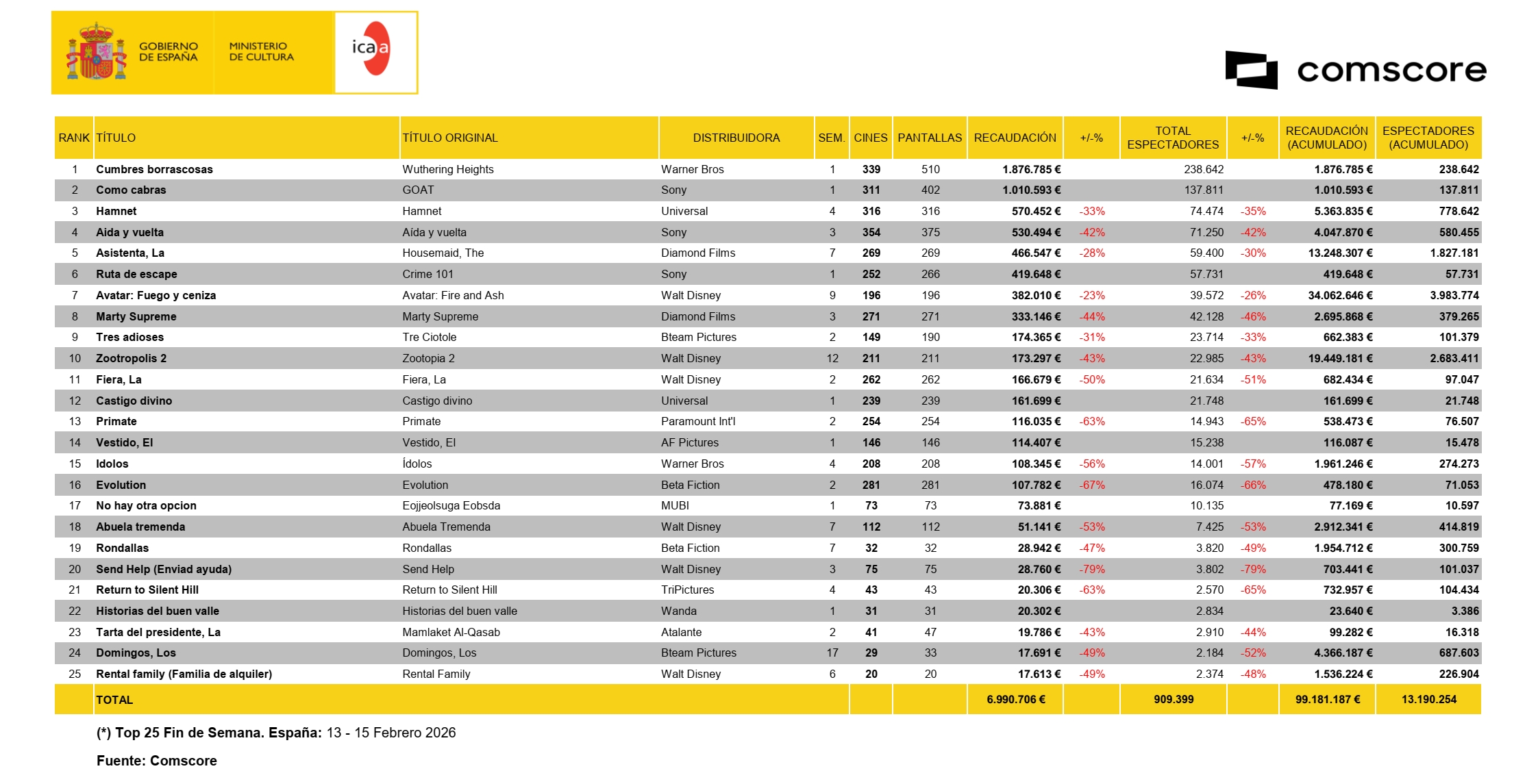 Mientras tanto, podéis comprobar en la imagen adjunta qué tal les está yendo -por este orden- a títulos como 'Marty Supreme', 'Anaconda', 'Bob Esponja: Una aventura pirata', 'Song Sung Blue - Canción para dos', 'No hay otra opción', 'Hamnet', 'The Plague', 'El agente secreto', 'Eternity', 'Resurrection' o 'Valor sentimental', entre otras.