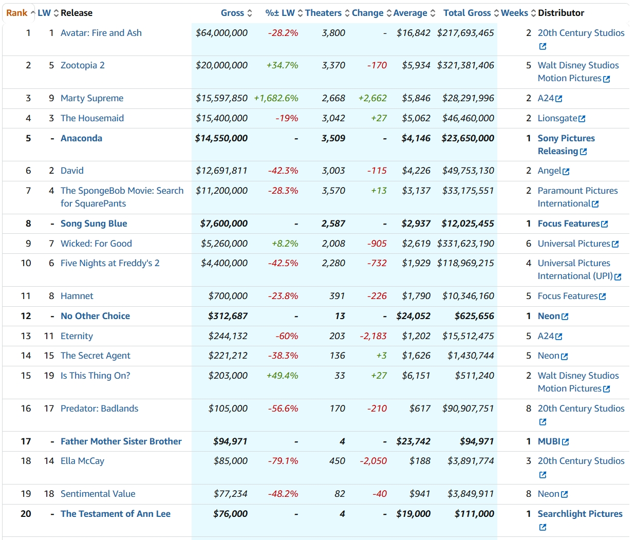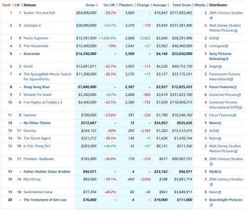 La duda, también, está en saber si 'Marty Supreme' se convertirá en la película más taquillera de A24. Todo apunta a que, en efecto, lo acabará siendo. Sin ir más lejos, en su lanzamiento en 2.668 cines ha recaudado un millón más que 'Anaconda' en su estreno en 3.509. O el doble que 'Song Sung Blue - Canción para dos' en un número similar de salas.