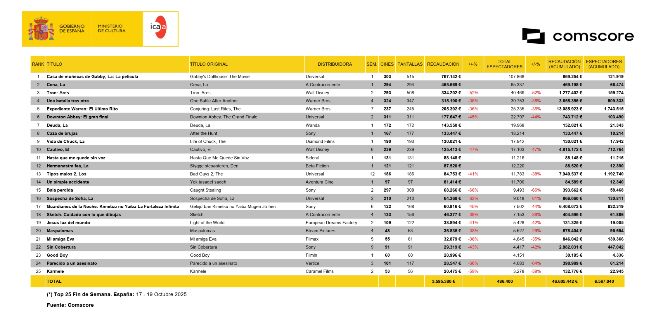 Por último, destacar los casi 400.000 euros que ha logrado 'Sirat' en su estreno en 183 cines de toda España. Un resultado notable para una película de un cineasta como Óliver Laxe, por más que esté respaldada por Movistar Plus+.