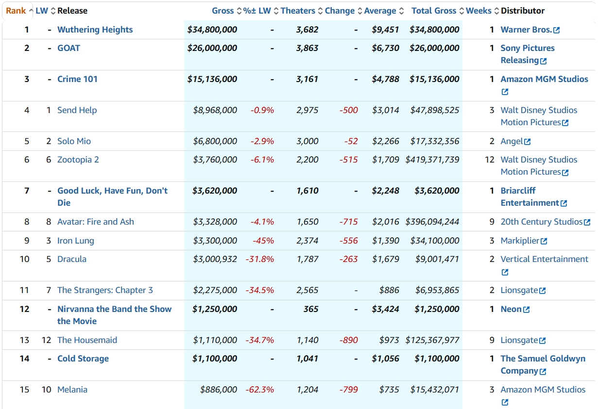 En fin, que la nueva versión de la única novela de Emily Brontë ha cumplido las previsiones, mientras que 'Como cabras' las ha superado... al menos en Estados Unidos, donde ha sumado 26 millones en su primer fin de semana; que serán más de 30 contando que el lunes es festivo allá, cerca de 50 contando el mercado internacional.