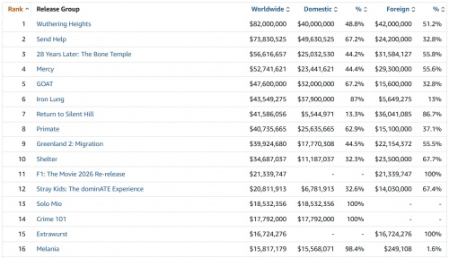 Grandes estudios como la antigua FOX, el que respalda a 'Send Help (Enviad ayuda)', que este fin de semana (festivo) ha alcanzado los 50 millones en Estados Unidos; y lo ha hecho después de dejarse menos del 1% respecto al fin de semana pasado. Un dato llamativo para una película que, eso sí, acabará recaudando en casa más del doble de lo que recaudará en el mercado internacional... a diferencia de por ejemplo 'Hamnet' que, redondeando, ha recaudado 60 de sus 80 millones en el mercado internacional.