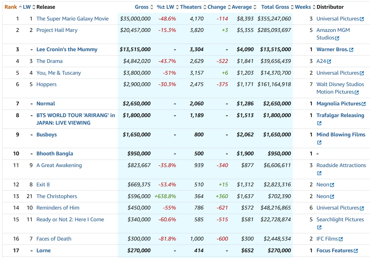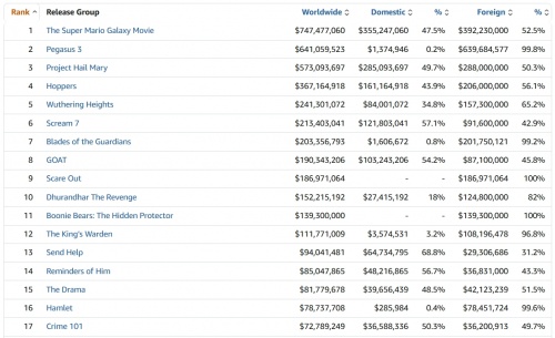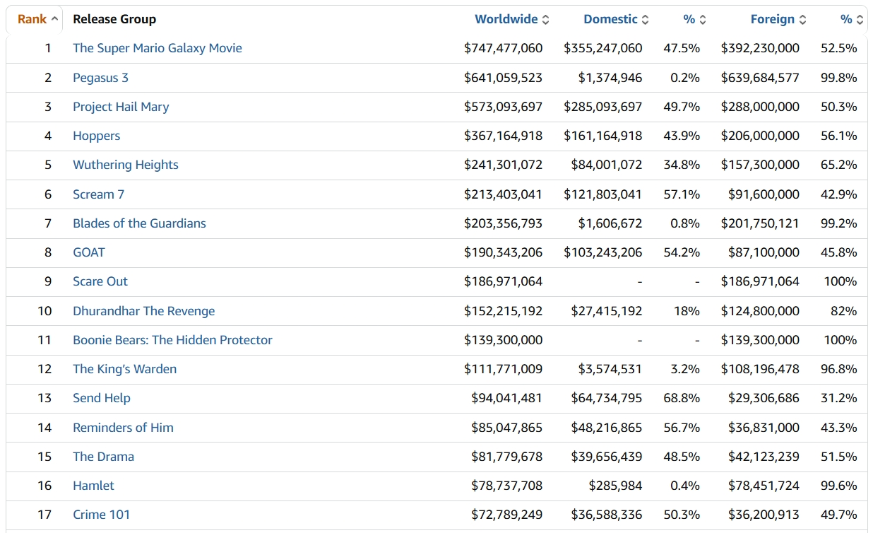 Al grano: Con casi 750 millones (siempre) de dólares, 'Super Mario Galaxy: La película' ya es la película más taquillera del año a nivel mundial (por encima de la producción china 'Pegasus 3'). Por su parte 'Proyecto Salvación' es la tercera, con 573 millones.