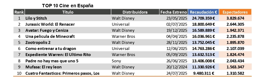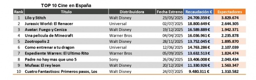 Por su parte 'Lilo y Stitch' y 'Jurassic World: El renacer' lideran el ranking de las películas con más recaudación y más espectadores, si bien todo apunta a que 'Avatar: Fuego y ceniza' acabará siendo la película estrenada en 2025 más taquillera y más vista. Destacar por su parte que 'Zootrópolis 2' también aspira a superar a 'Una película de Minecraft' como la cuarta película con más recaudación y/o espectadores de 2025.