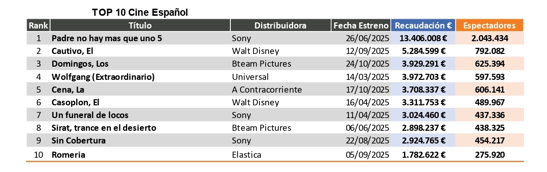 La quinta (y en principio última) entrega de 'Padre no hay más que uno' se sitúa, una vez más y al igual que sus predecesoras, en lo más alto del ranking del cine nacional, seguida por 'El cautivo' y 'Los domingos', esta todavía en cartelera y a la espera del impulso de las nominaciones a los Goya. El cine español cierra 2025 con una cuota de mercado del 19% (la misma que en 2024), un total de 12 millones de espectadores y una taquilla de 78 millones de euros.