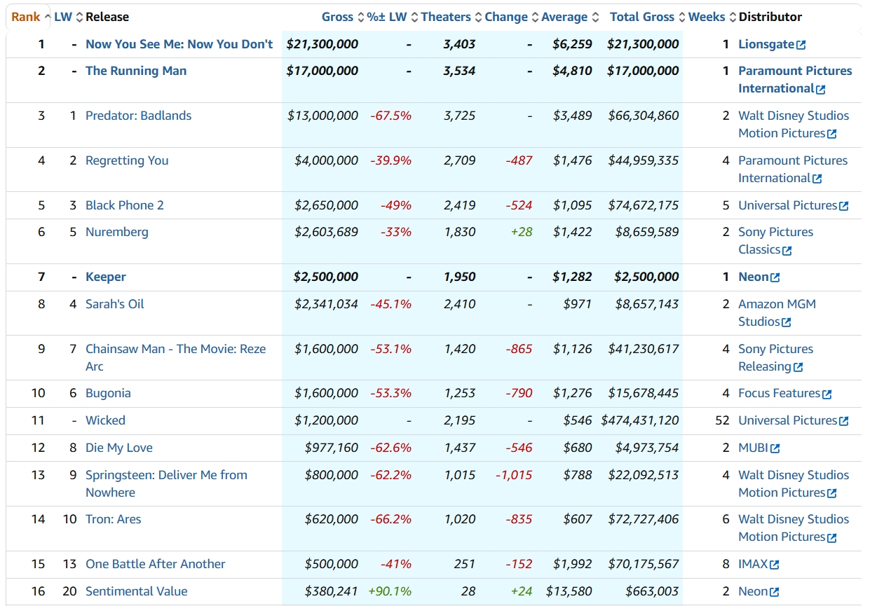 Tampoco 'Predator: Badlands' parece que vaya a superar los 105 millones que ha costado a su paso por los cines de Estados Unidos, después de dejarse más de un 67% respecto a su fin de estreno. Un resultado por demás esperable que, además, pone en duda que pueda ser capaz de superar los 177 millones que 'Alien vs. Predator' recaudó en todo el mundo en 2004. Le faltan 40 millones... y por cierto, tan sólo 4 para superar los 140 millones de una 'TRON: Ares' de la que obviamente se esperaba mucho más.
