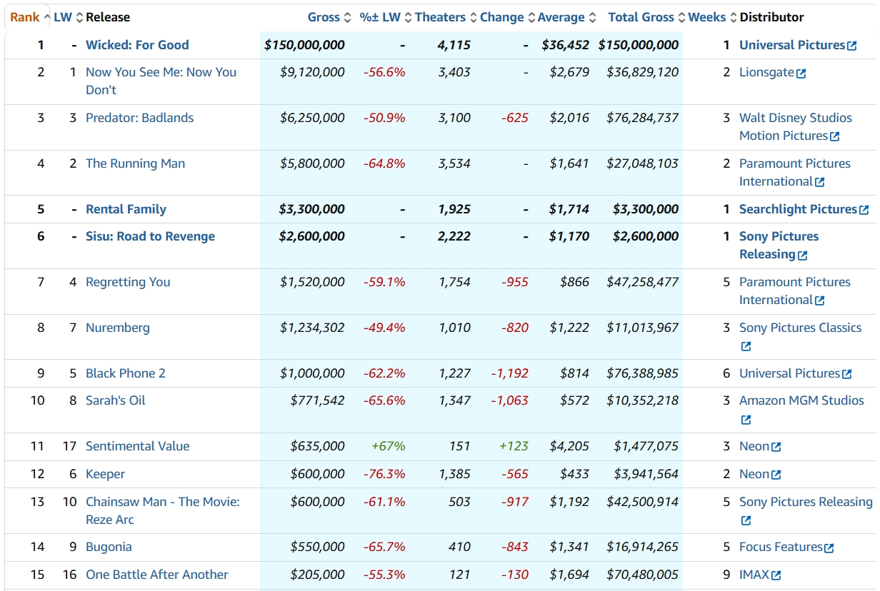 Las que no lo han petado son 'Rental Family (Familia de alquiler)' y 'Sisu: Camino a la venganza', algo por otro lado esperable habida cuenta de su modesto lanzamiento en 1.925 y 2.222 cines, respectivamente. Ni tan mal, siendo como son sendas películas tirando a baratas que tendrán una muy buena segunda vida en otros formatos, ya que no dependen de su exhibición en salas para ser consideradas un éxito.