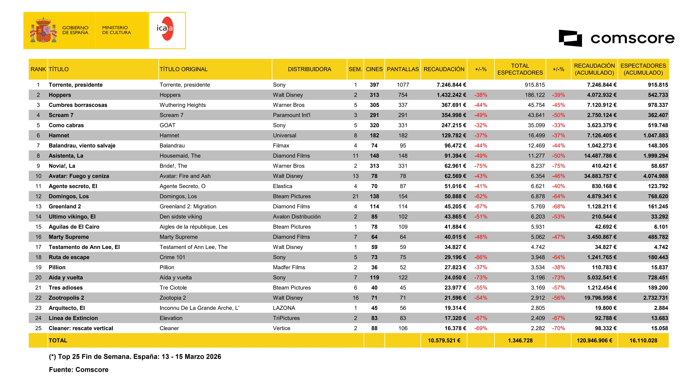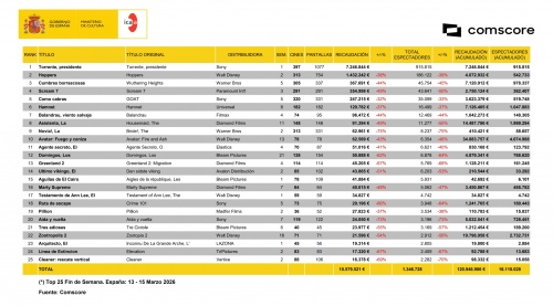 Por su parte, 'Hamnet' recauda un millón en su segundo fin de semana en los cines españoles, casi lo mismo que en el primero, y suma ya más de tres en sus diez primeros días en cartelera. Después de haber liderado la taquilla de lunes a jueves, apunta a tener una carrera tan longeva y próspera en nuetro país como las de 'La asistenta', 'Avatar: Fuego y ceniza' o 'Zootrópolis 2'.