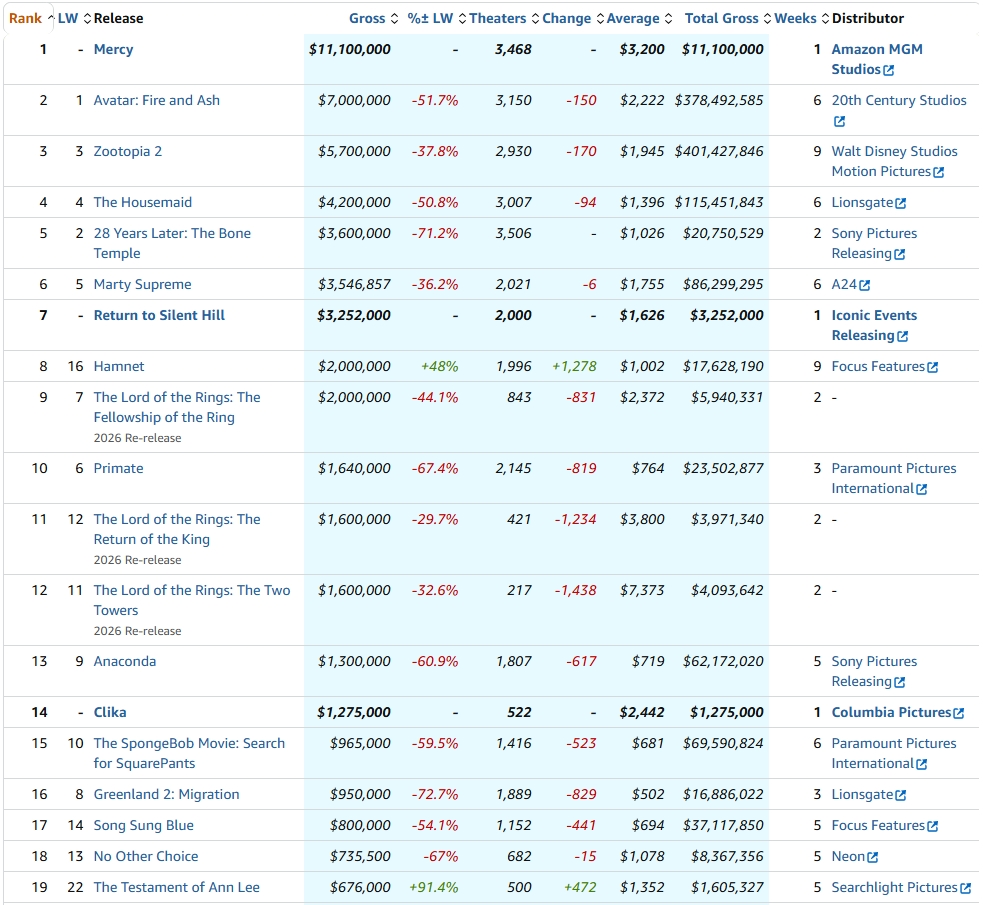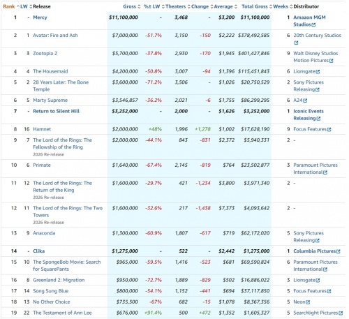 No para las de EE.UU., con 'Sin piedad' como nuevo (y triste) lider con poco más de 11 millones, la mitad de lo que ha recaudado en todo el mundo. No parece un gran resultado para una producción de 60 millones, si bien recordemos que se trata de una película de Amazon MGM Studios: Con cubrir los costes de su exhibición en salas y de publicidad, casi que le basta, ya que lo realmente importante es posicionarla de cara a su posterior lanzamiento en Prime Video...