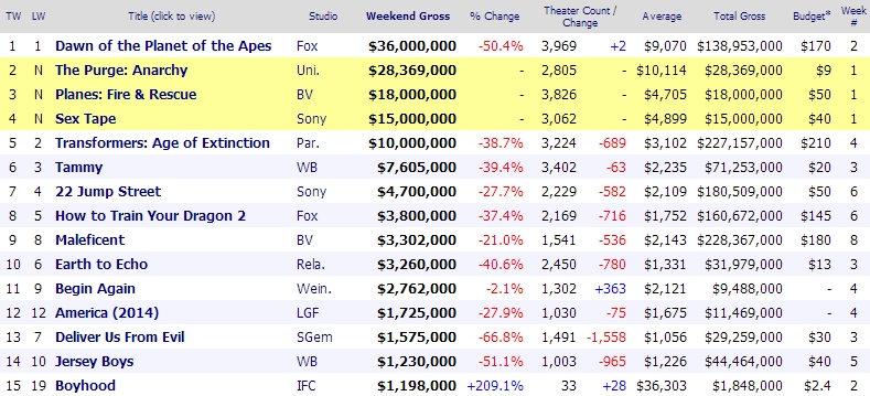 Otras dos secuelas llegaban esta semana a los cines norteamericanos, y la dos vienen a rendir en igual proporción. Tanto 'Anarchy: La noche de las bestias' como 'Aviones: Equipo de rescate' abren en segundo y tercer puesto ligeramente por debajo de sendos precedentes estrenados el año pasado, que marcaron 34 y 22 millones respectivamente. Habida cuenta de unos gastos muy ajustados y de unas expectativas igual de moderadas, pase lo que pase a partir de la semana que viene ambas prácticamente ya se han asegurado dar beneficios, por no mencionar la posibilidad de que ambas franquicias repitan presencia por tercer año consecutivo el próximo verano...