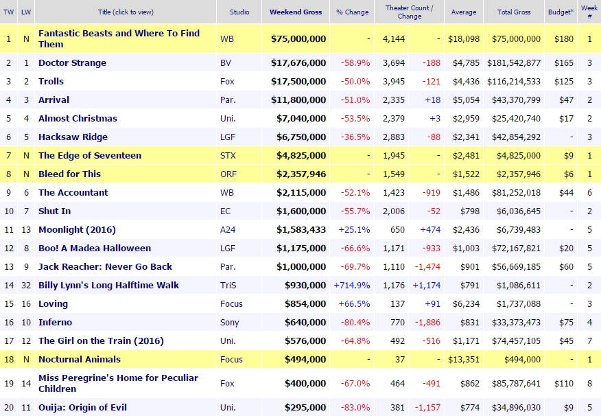 Dejando de lado la aparente poca transcendencia de los estrenos de 'The Edge of Seventeen' o 'Bleed for This', así como los fuertes descensos motivados por la irrupción de la magia en la taquilla, también se puede calificar de muy buena la entrada de 'Manchester frente al mar', aunque no alcance para aparecer en la foto de las veinte primeras. La cinta, nos cuentan que una de las grandes aspirantes a los Óscar, consigue algo más de 240.000 dólares en cuatro cines logrando la tercera mejor media del año por encima de la conseguida la semana pasada por 'Billy Lynn' que, muy a su pesar, se la pega esta semana en su ampliación a más de 1.000 cines: no llega ni al millón de dólares a una triste media de 791 dólares. El veredicto es cruel, pero también irrefutable.