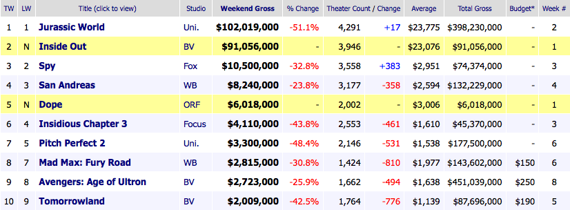 A pesar de que 'Jurassic World' sigue demostrando su hegemonía cómo uno de los estrenos más potentes del año con 102 millones en su segundo fin de semana, todas las miradas este fin de semana estaban plantadas en el regreso de Pixar: 'Del revés (Inside Out)'. La cinta, que ha sido completamente alabada por la crítica, quienes no dudan en colocarla en los puestos más altas de la filmografía de la compañía, también ha demostrado su valía en la taquilla, consiguiendo no sólo ser la segunda película de la compañía que más recauda en su estreno tras 'Toy Story 3' si no también llevarse el logro de ser la nueva propiedad intelectual (entiéndase cómo que no es una secuela/remake/reboot) más taquillera en su estreno de la historia. La cinta consigue la segunda plaza con 91 millones de dólares a los que sumar 41 en el mercado internacional (se ha estreno en muy poquitos territorios).