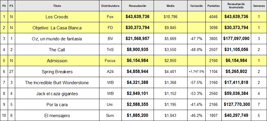 Sin ir más lejos el anterior título de la casa y último que distribuyó Paramount Pictures a finales del año pasado, 'El origen de los guardianes', recaudó algo más de 100 millones en USA para un total mundial de unos 300... cifras bastante buenas que a filmes como 'G.I. Joe' le valieron para poner en marcha una secuela que se estrena esta misma semana. Sin embargo los costes de producción de DreamWorks Animation, en torno a los 150 millones de dólares por película más unos 100 millones en inversión publicitaria, así como la enorme estructura sobre la que se apoya la empresa para funcionar provocaron que la cinta fuera considerada un pinchazo que arrojó pérdidas e incluso ocasionó el despido de algún trabajador, siendo además una de las causas de la cancelación de un proyecto como 'Me and My Shadow' cuando la Fox "obligó" a la compañía, todavía presidida por Jeffrey Katzenberg, a no estrenar más de dos filmes al año para reducir costes y tomar ejemplo de Blue Sky, que invierte prácticamente la mitad en cada una de sus siempre rentables producciones. Por lo general este tipo de producciones familiares, con prácticamente dos mes por delante sin competencia directa (hasta la llegada de precisamente lo nuevo de Blue Sky, 'Epic: El mundo secreto', que también distribuye Fox), y un mínimo de aceptación por parte de la audiencia (como parece que así será en este caso) suelen llegar a multiplicar su dato inicial al menos por cuatro, por lo que la cinta tiene todo a su favor para ser un éxito y rondar los 150 millones de dólares sólo en Estados Unidos... e incluso con suerte, sueñan sus responsables, repetir el éxito que fue 'Cómo entrenar a tú dragón', estrenada hace tres años por estas mismas fechas y que debutó con un dato muy similar, relativamente bajo en comparación con los grandes éxitos de la compañía, pero que acabó multiplicando por más de cinco, un comportamiento fantástico que habrá que ver si se repite. Y todo eso sin tener en cuenta el mercado internacional. El tiempo despejará las posibles dudas. Con DreamWorks a la espera de descorchar el champán la gran vencedora moral de la semana es FilmDistrict, compañía que por fin ve como uno de sus estrenos cumple, y con creces, si bien no es menos cierto que también ha sido una de las veces que más se lo ha currado. Con el doloroso fracaso de 'Dead Man Down (La venganza del hombre muerto)' -10,6 millones en tres semanas- todavía reciente gracias a 'Objetivo: La Casa Blanca' Gerard Butler no sólo salva al Presidente de Estados Unidos... e incluso puede que su carrera tras cinco fracasos comerciales seguidos, sino también a sus responsables merced a los más de 30 millones recaudados en su primer fin de semana, superando holgadamente los 20 millones que se habían fijado para dar por bueno su lanzamiento. Su buena valoración entre el público permite además albergar esperanzas de cara a un futuro en el que mucho tendrá que ver un rival tan directo como 'G.I. Joe: La venganza', que se estrena esta semana y cuyas expectativas, la verdad, son toda una incógnita... una muy peligrosa incógnita para su estudio distribuidor, Paramount, que con esta producción arrastra el mismo problema al que no pudo vencer la Warner Bros. con 'Jack el caza gigantes': un sorprendente retraso de más de ocho meses y un pornográfico coste de producción. Aunque baja del primer al tercer lugar la producción de Disney 'Oz. Un mundo de fantasía' resiste muy bien en su tercera semana en cartel. A pesar de la competencia directísima de un título como el de DreamWorks Animation aguanta por encima de los 20 millones de dólares gracias a un excelente descenso del 46% dada las circunstancias, por lo que ya suma más de 175 millones de dólares sólo en Estados Unidos (y más de 350 en todo el mundo). Aunque sus resultados quedarán lejos de los de 'Alicia en el país de las maravillas' hace tres años, hecho que sin duda será aprovechado por sus detractores para menospreciarla, no cabe duda de que es un éxito que dejará más que satisfecha a una Disney que ve como el fantasma de 'John Carter' se aleja... al menos hasta el verano, momento en el que llegará ese auténtico (y desorbitado) órdago llamado 'El llanero solitario'. Destacar por su parte el notable incremento de recaudación de 'Spring Breakers', que tras su estreno limitado la semana pasada se expandía a más de mil salas para recaudar en torno a los 5 millones de dólares, una cifra no muy inferior a los 6,4 millones de dólares recaudados por 'Admission', comedia protagonizada por Tina Fey y Paul Rudd que Focus Features estrenaba sin demasiado entusiasmo, de ahí que no sorprenda un resultado tan poco entusiasta, y que se proyecta en prácticamente el doble de cines. De momento la novel A24 -a diferencia de Vértigo Films en España- ha sabido jugar sus bazas y le ha dado muy buena visibilidad al filme de Harmony Korine, si bien es posible que haya cometido un error de cálculo propiciado por la alegría de la semana pasada. Y es que tras su excelente arranque la media de esta semana, de 4.529 dólares por cine, hace sospechar que su expansión por encima de las 1000 copias puede haber sido excesiva (cuando inicialmente estaba previsto que fueran la mitad) y que le faltarán fuerzas para convertirse en el sleeper que parecía que podría haber llegado a ser. No obstante teniendo en cuenta su coste de producción, de apenas dos millones de dólares, cualquier cifra a partir de ahora será muy bien recibida por lo que ya nadie puede dudar de su rentabilidad. Por último y dentro del top 10 destacar el dispar comportamiento de los dos principales estrenos de la semana pasada, si bien con connotaciones claramente opuestas. Y es que los dos filmes "sorprendieron" en su estreno, pero mientras que 'The Call' lo hizo para bien, provocando que su abrupto descenso del 49% realce lo alcanzado la semana pasada para sumar un total de más de 30 millones