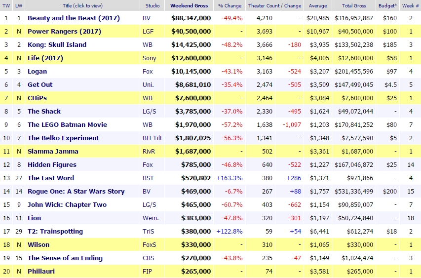 Por contra el otro gran estreno de la semana, 'Life (Vida)', no tiene tanta suerte. A pesar de la contagiosa alegría de Jake Gyllenhaal y Ryan Reynolds durante su promoción, y a pesar del entusiasmo despertado entre la crítica y el público (que la ha visto), se ha de conformar con unos 12,5 millones de dólares. Una cifra algo escasa, si bien un presupuesto ajustado y el mercado internacional ayudarán a que las cifras, posiblemente, acaben cuadrando. Siempre queda China por ahí...
