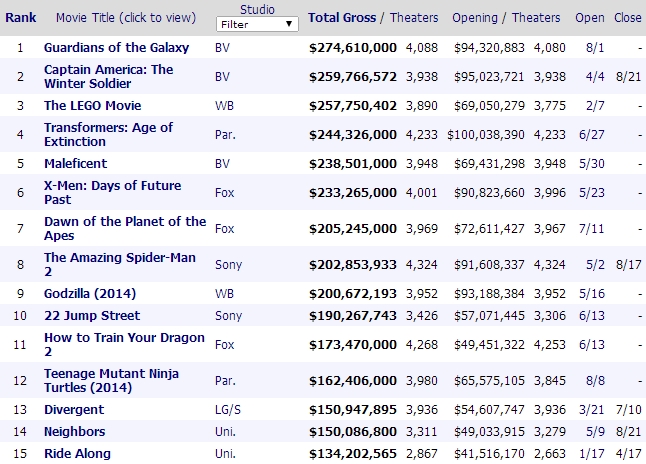 Fin. Se acabó el verano. Y lo hace con 'Guardianes de la Galaxia' convertido ya en el filme más taquillero de los estrenados en Estados Unidos a lo largo de este año 2014, si bien a nivel internacional sólo es el octavo -de momento- y queda la duda de sí le llegarán las fuerzas para superar los 300 millones de dólares, cifra que por cierto es la primera vez en más de diez años que a estas alturas del año nadie ha superado. Mientras ninguno de los dos grandes estrenos de la semana, 'Así en la Tierra como en el Infierno' y 'La conspiración de noviembre', logran llamar especialmente la atención con sendas recaudaciones sobre los 9 millones desde su estreno, si bien hablamos de dos inversiones tan moderadas como para estrenarse durante el último fin de semana del verano, tradicionalmente un punto final poco relevante.