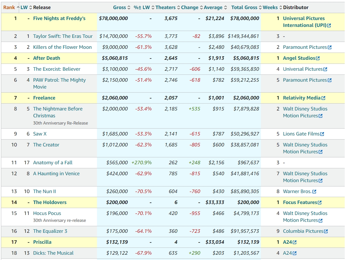 'Cinco noches en Freddy's' ha recaudado unos 78 millones (siempre) de dólares en su estreno en 3.675 cines de Estados Unidos, a lo que cabe sumar otros 50 millones en el mercado internacional. Esto es, en tres días ya ha recaudado más de lo que 'El exorcista: Creyente' acabará recaudando en toda su carrera... El éxito de la primera le compensará a Universal Pictures el fracaso de la segunda.