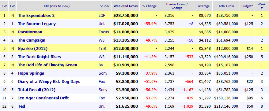 Flojo fin de semana en los Estados Unidos a pesar de que ya acabaron los Juegos Olímpicos. Stallone y sus chicos han vuelto a liderar la taquilla con la segunda entrega, 'Los mercenarios 2', que han logrado una recaudación de 28,7 millones de dólares en su fin de semana de estreno en las 3.316 salas en las que se ha proyectado. La película se queda cerca de la primera parte estrenada en 2010 (aunque se esperaba algo más), que recaudó 34,8 millones de dólares en su estreno también en el mes de agosto y terminó con una recaudación mundial de 274 millones. Hasta el momento cuenta con un 8 en IMDb, por un 6,5 de la cinta original.