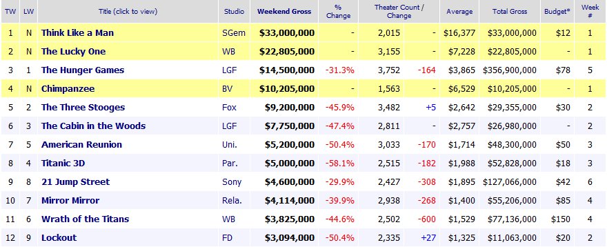 Tras cuatro semanas liderando la taquilla estadounidense, el reinado de 'Los juegos del hambre' llega a su fin. Lo que tal vez no se esperaba es que la película que la desbancase del número uno del podium fuera 'Think Like a Man', comedia romántica del realizador Tim Story centrada en un hombre, consejero matrimonial, que no es capaz de mantener su propia vida amorosa en orden. Con un reparto no muy destacado, la película ha recaudado 33 millones de dólares y cuenta con un 3,8 en IMDb. Otra prueba de que en muchas ocasiones la taquilla no es sinónimo de calidad.