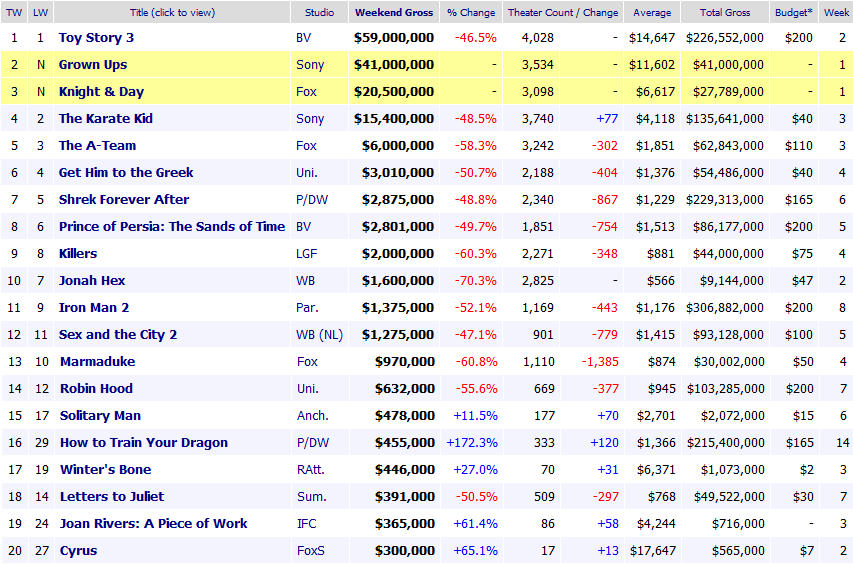 'Toy Story 3' ha seguido dominado con extraordinaria fuerza el box-office americano, recaudando en su segunda semana unos fuertes $59,0 millones. De momento la película levanta su total en 10 días a los 226,5 millones. La presencia de 'Niños grandes (Grown Ups)' así como 'Knight & Day' puede haber desviado ligeramente la atención adulta y juvenil, de ahí que no hubiera barrido por completo la taquilla de nuevo. De momento el film de Pixar conserva mucha energía así como el mejor boca a boca de la cartelera y esto le permitirá seguir volando lejos. La semana que viene recibirá la fuerte competencia de 'Eclipse' y 'Airbender: el último guerrero', ambas muy pensadas para el sector juvenil, por lo que puede que 'Toy Story 3' pueda conservar su fidelidad entre el público más familiar, así como empezar a repescar a estos adultos que se hacer suplicar durante los primeros días, especialmente afectados por la aglutinación de algunas salas. El film sigue manteniendo sus opciones de una recaudación final de 360-380 millones de dólares.